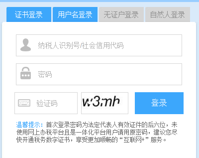 温馨提示:首次登录密码为法定代表人有效证件的后六位,未使用网上办税平台且是一体化平台用户请用原密码,建议您尽快开通税务数字证书,享受更加顺畅的“互联网+”服务。