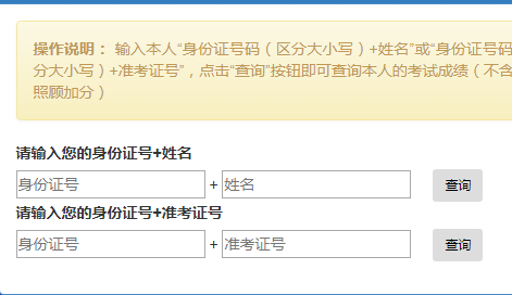 操作说明: 输入本人“身份证号码(区分大小写)+姓名”或“身份证号码(区分大小写)+准考证号”,点击“查询”按钮即可查询本人的考试成绩(不含政策照顾加分)