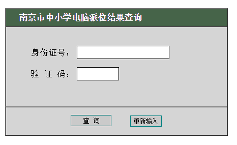 http://xsc.njzb.org/xsc_jgcx.asp 南京市中小学电脑派位结果查询 考研网(25-12-16) 南京招生门户网站19 ·管理入口 ·设为首页 ·加入收藏http://www.xuecan.net/zhuanti/28025/ 南京市2019年中小学电脑派位结果查询 身份证号: 验 证 码: http://www.xuecan.net/zhuanti/28025/ http://xsc.njzb.org/xsc_jgcx.asp 南京市中小学电脑派位结果查询