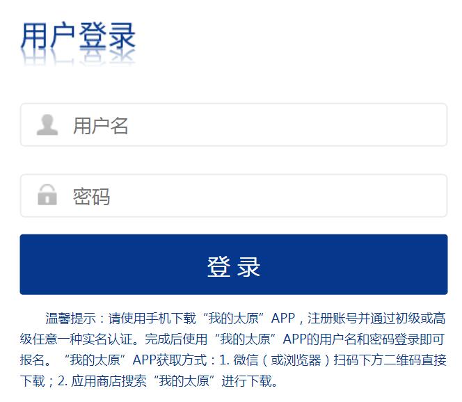 温馨提示:请使用手机下载“我的太原”APP,注册账号并通过初级或高级任意一种实名认证。完成后使用“我的太原”APP的用户名和密码登录即可报名。“我的太原”APP获取方式:1. 微信(或浏览器)扫码下方二维码直接下载;2. 应用商店搜索“我的太原”进行下载。http://www.xuecan.net/zhuanti/28207/