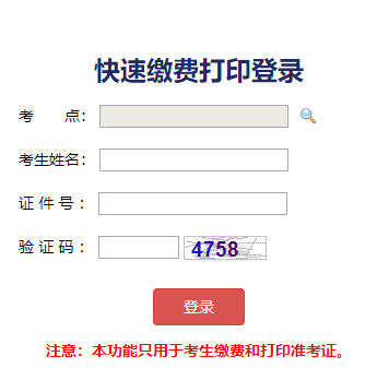 http://ncre.jseea.cn/NCRE_EMS/FastLogin.aspx江苏计算机等级考试缴费打印登录 考研网(25-12-16) http://ncre.jseea.cn/NCRE_EMS/FastLogin.aspx江苏计算机等级考试快速缴费打印登录 快速缴费打印登录 考 点: http://www.xuecan.net/zhuanti/29081/ 考生姓名: 证 件 号 : 验 证 码 : 看不清?点击刷新http://www.xuecan.net/zhuanti/29081/ 注意:本功能只用于考生缴费和打印准考证。
