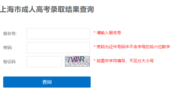 上海市成人高考录取结果查询http://www.shmeea.edu.cn/ 考研网(25-12-23) 上海市成人高考录取结果查询 报名号: 上海市成人高考录取结果查询 * 请输入报名号 密码: * 密码为证件号码中不含字母的后六位数字 验证码 * 按图中字符填写,不区分大小写点击更换 查询