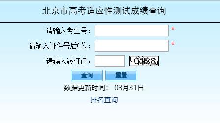 北京市高考适应性测试成绩查询https://www.bjeea.cn/ 考研网(25-12-23) 北京市高考适应性测试成绩查询https://www.bjeea.cn/ 北京教育考试院首页 | 网上综合查询系统 | 高考成绩查询 您当前的位置: 网上综合查询系统 >>高考成绩查询 北京市高考适应性测试成绩查询 请输入考生号: 请输入证件号后6位: 请输入验证码: 数据更新时间: 03月31日 排名查询 版权所有:北京教育考试院,未经同意,请勿转载! 通信地址:北京市海淀区志新东路9号 邮政编码:100083