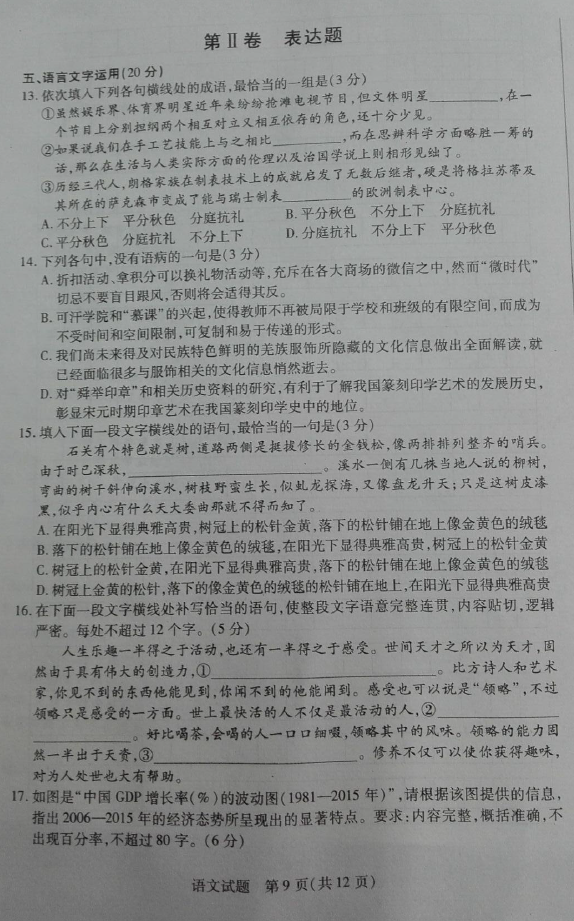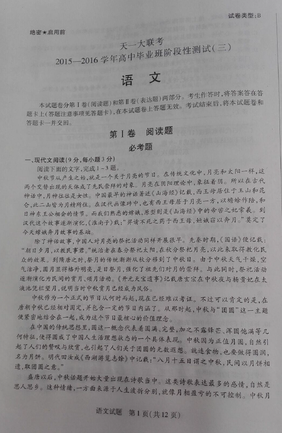 天一大联考2016年高中毕业班阶段性测试(三)语文试题