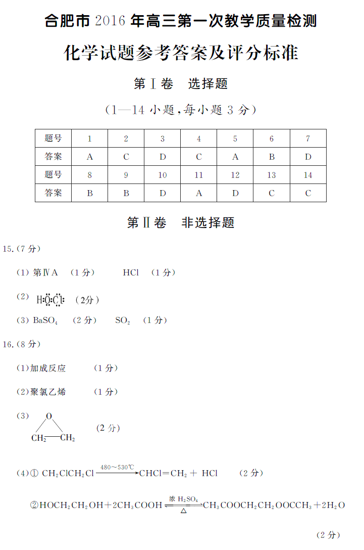 2016合肥一模化学答案